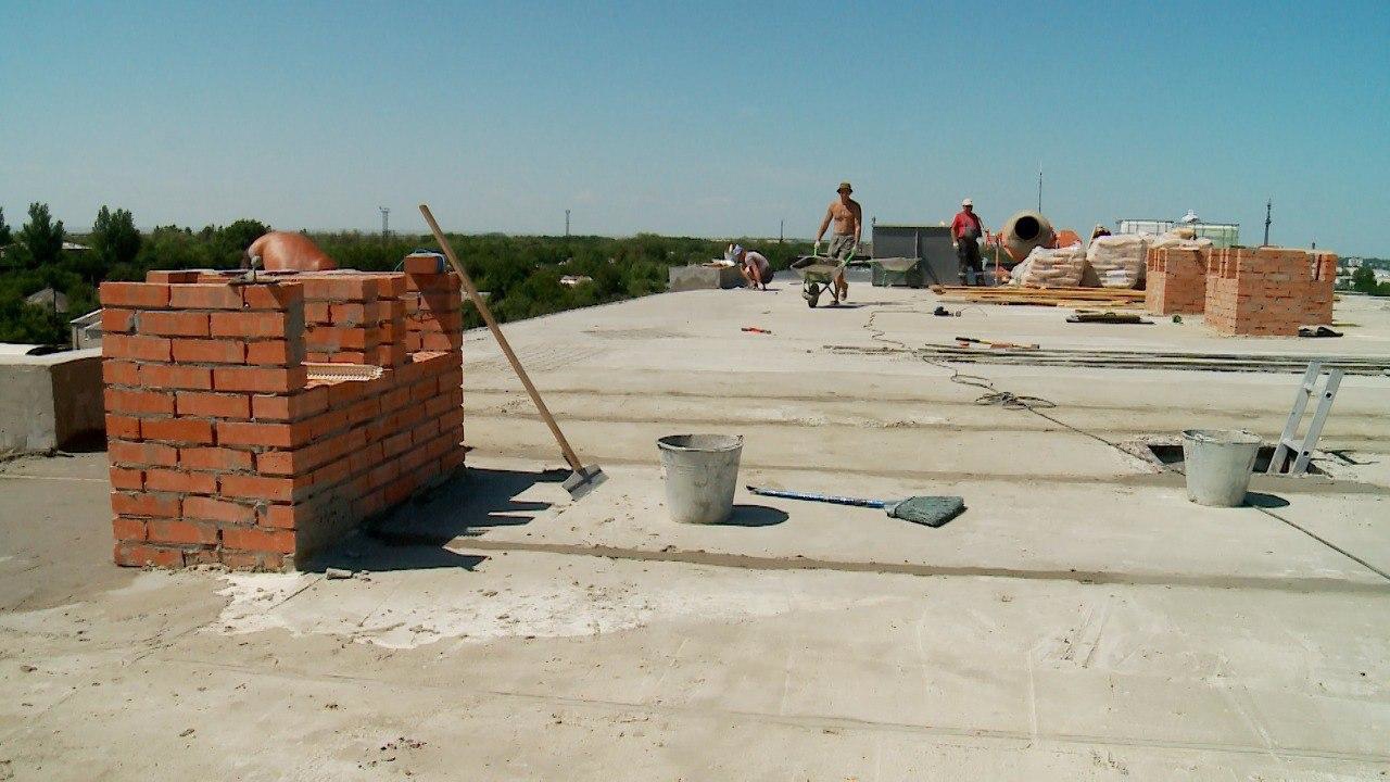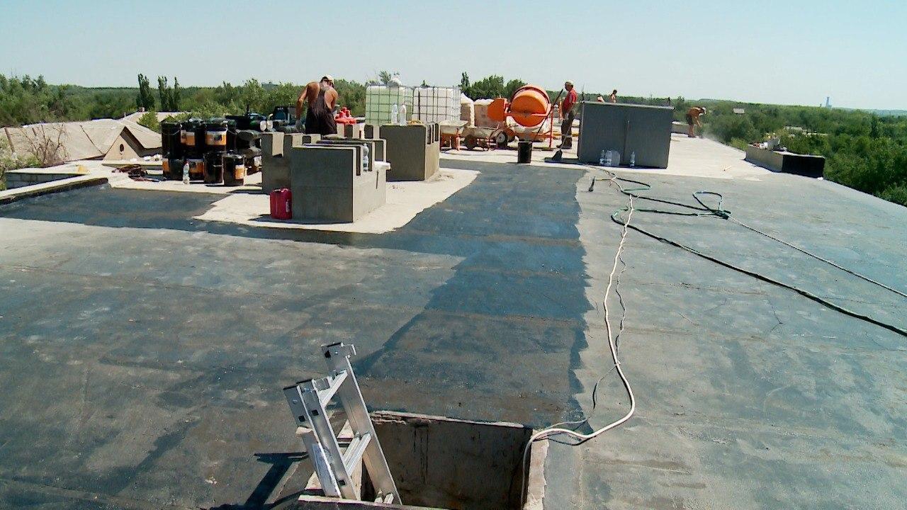 Специалисты уже приступили к ремонту кровли одного из 18 запланированных многоквартирных домов. Они заливают цементную стяжку, восстанавливают отливы и вентканалы. Впереди укладка нового гидроизоляционного материала.