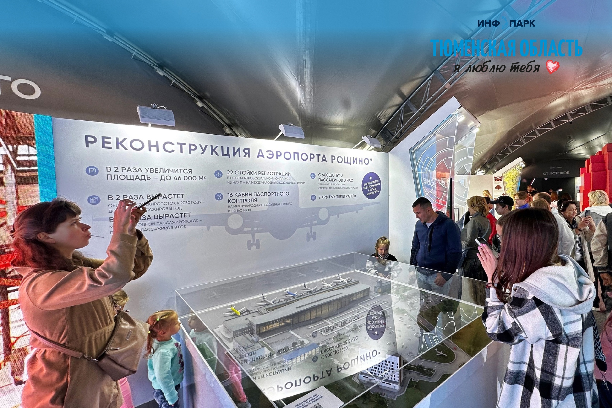 Увидеть макет обновленного аэропорта можно в инфопарке «Тюменская область, я люблю тебя». На стенде «Музей будущего» также представлены будущие кампус, рекреационный кластер «Жемчужина Сибири», завод полипропилена и другие объекты.
